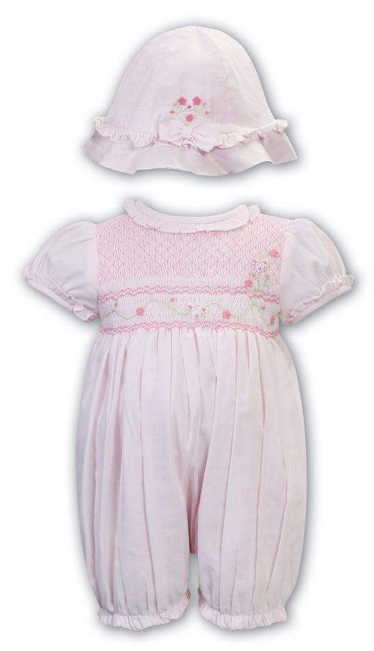 Sarah Louise - Hand smocked, Pink short leg all in one with matching hat