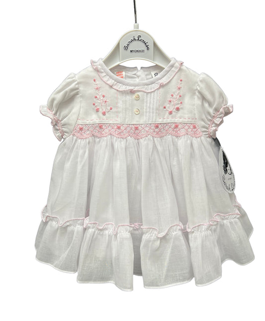 Sarah Louise - Traditional hand smocked Dress, white with pink details C7002