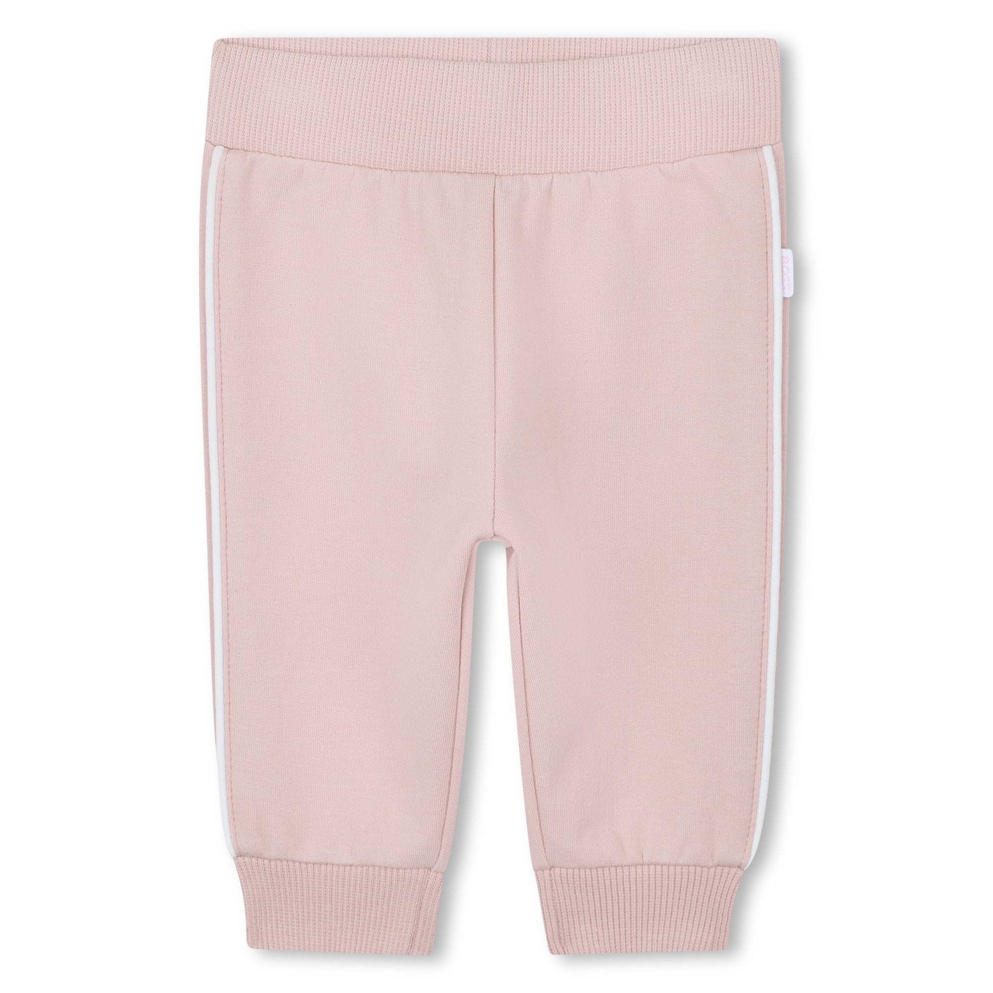 Dusty pink jogging bottoms with white side piping, 95% cotton, 5% elastane