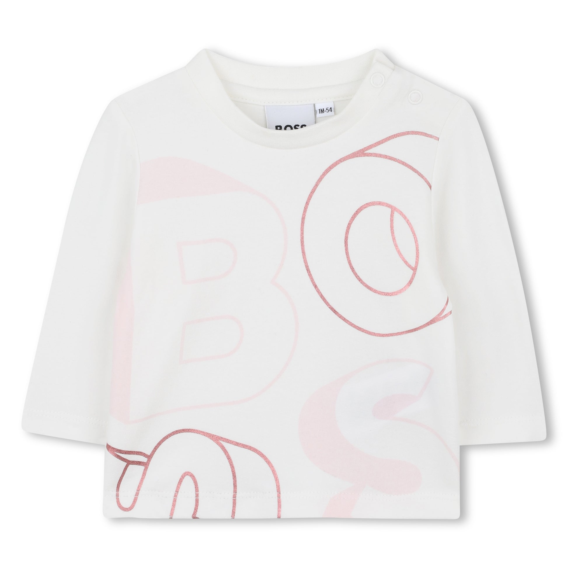 Long sleeved T-shirt with poppers on left shoulder, Pink and rose gold front print