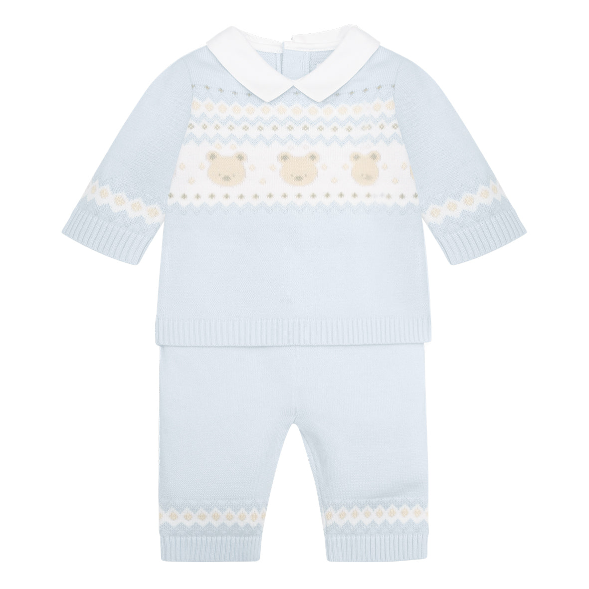 This charming three-piece set from Emile et Rose features a soft cotton knit top, bottoms, and a matching pale blue hat. The adorable teddy bear design adds a playful touch, making it perfect for your little one’s comfort and style. Crafted for gentle wear, this outfit ensures cozy days and sweet moments.