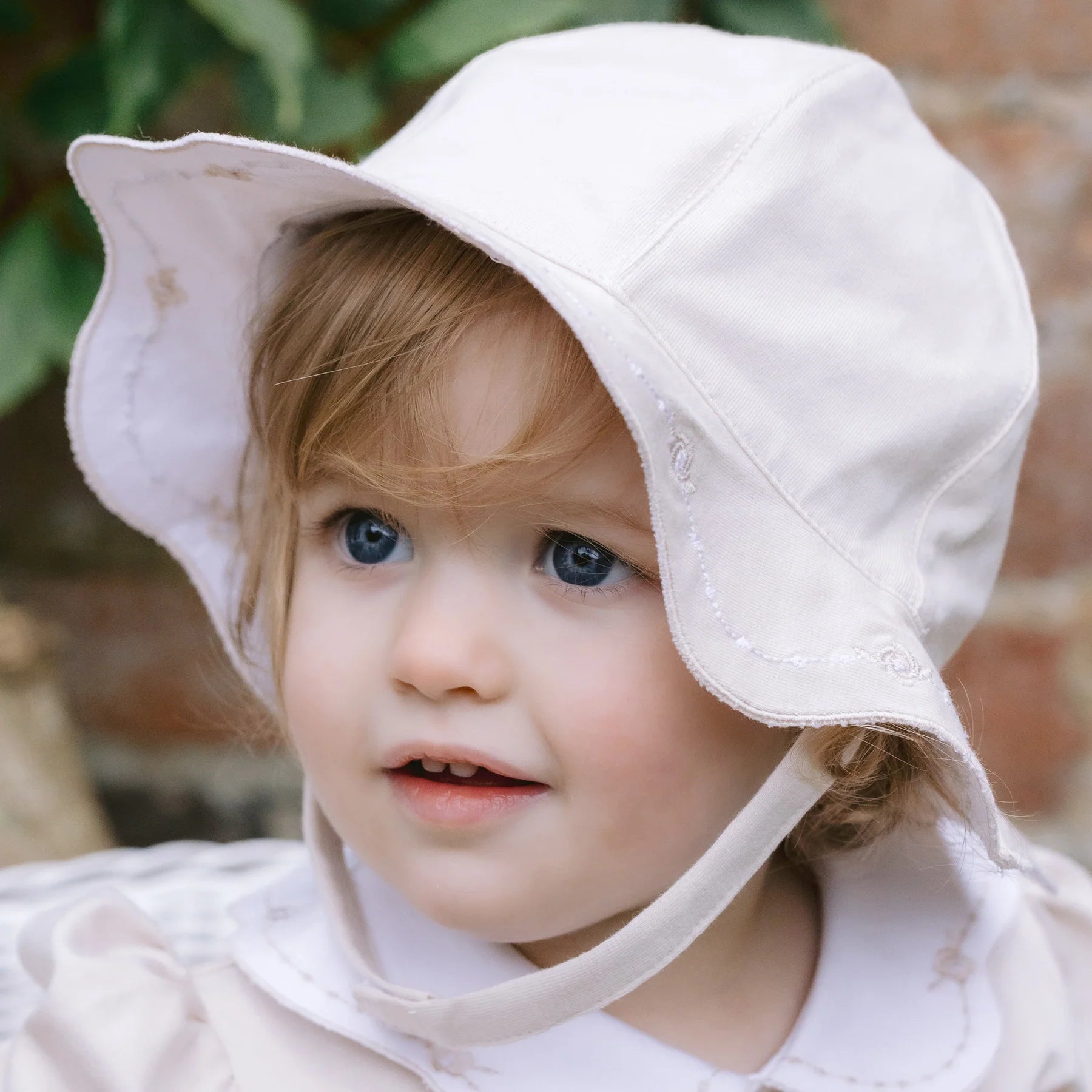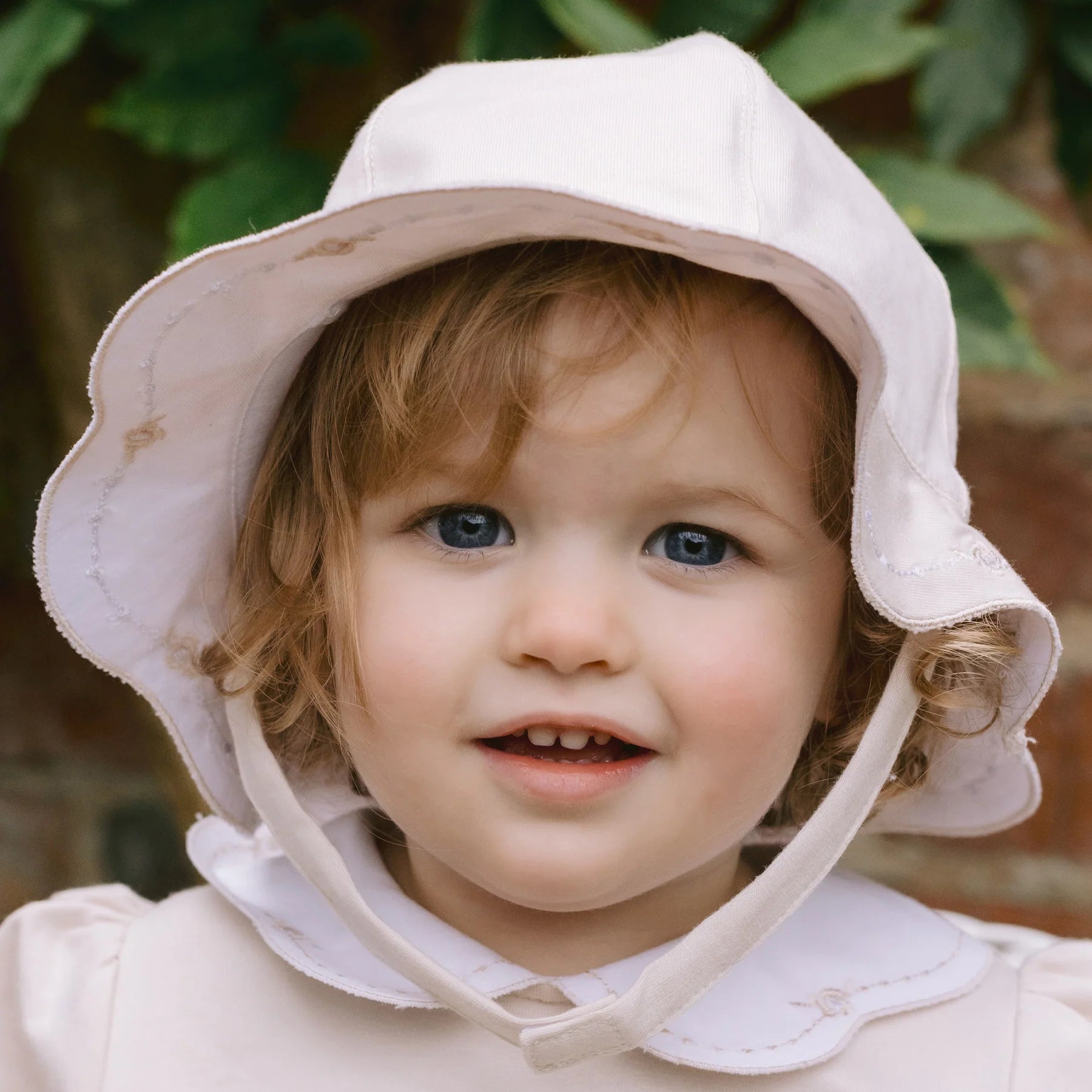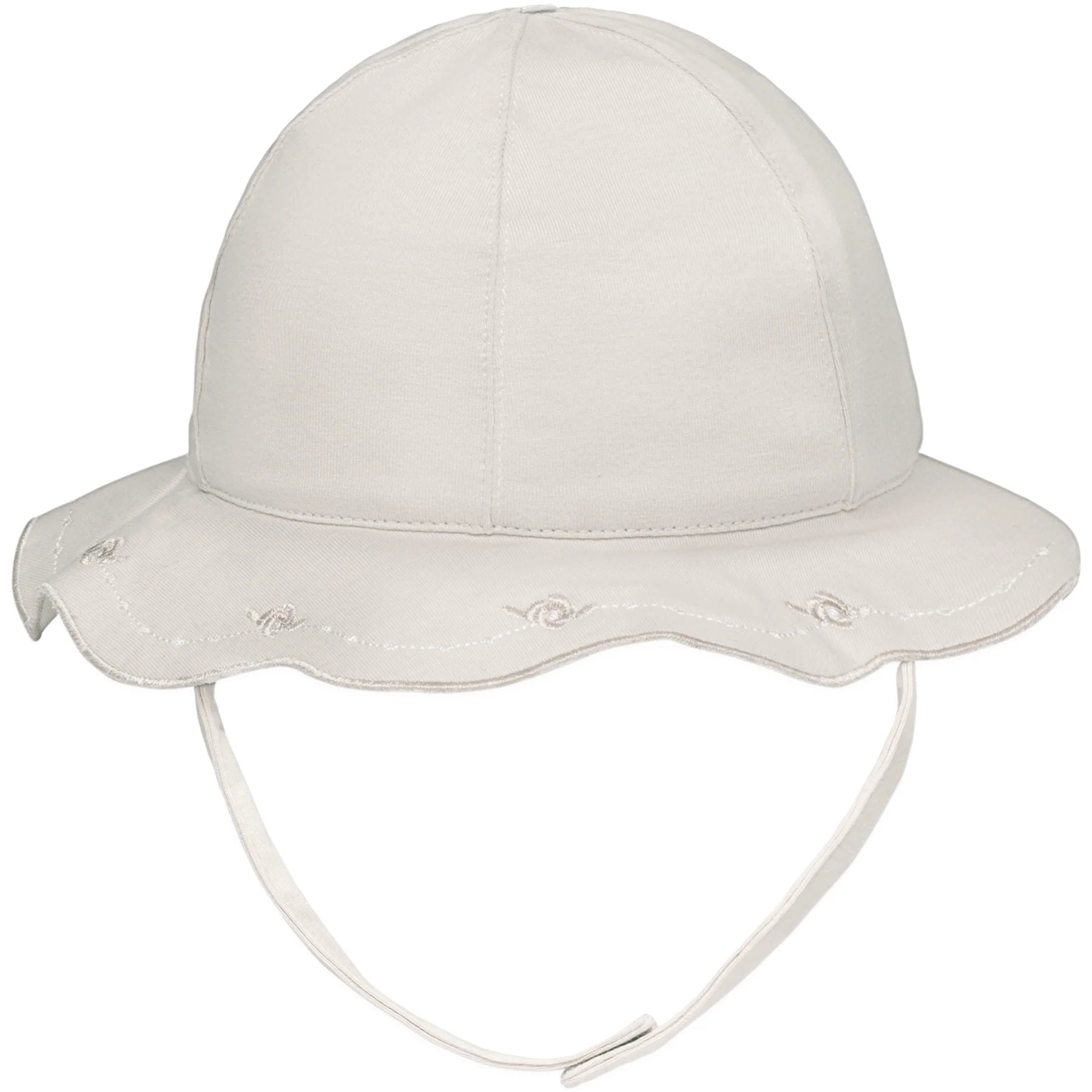 A lovely hat for summer! With an embroidered scalloped brim, soft cotton lining and a handy chin strap with soft Velcro fastening, it will stay secure on the breeziest days. Perfect accessory to go with our other stone coloured styles.