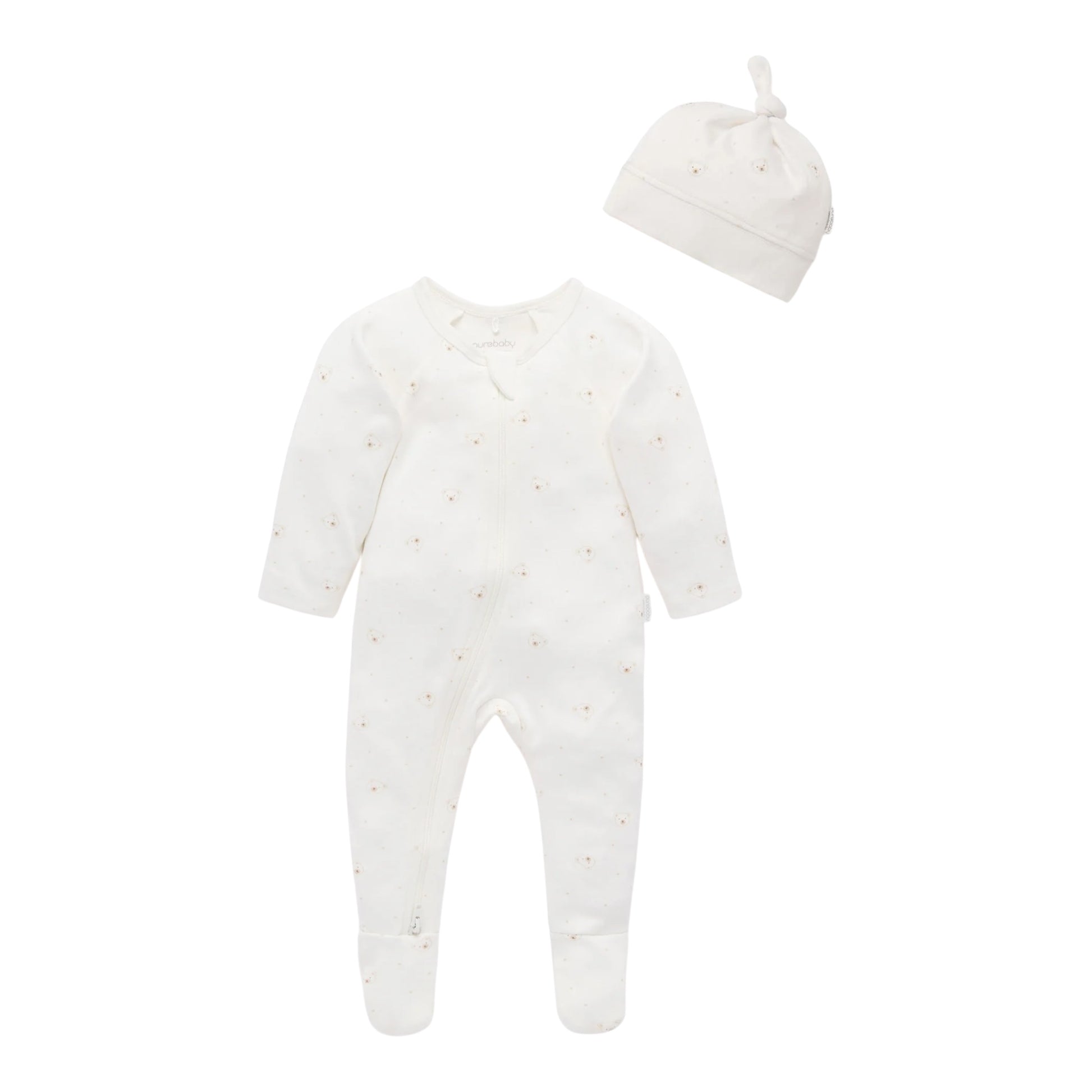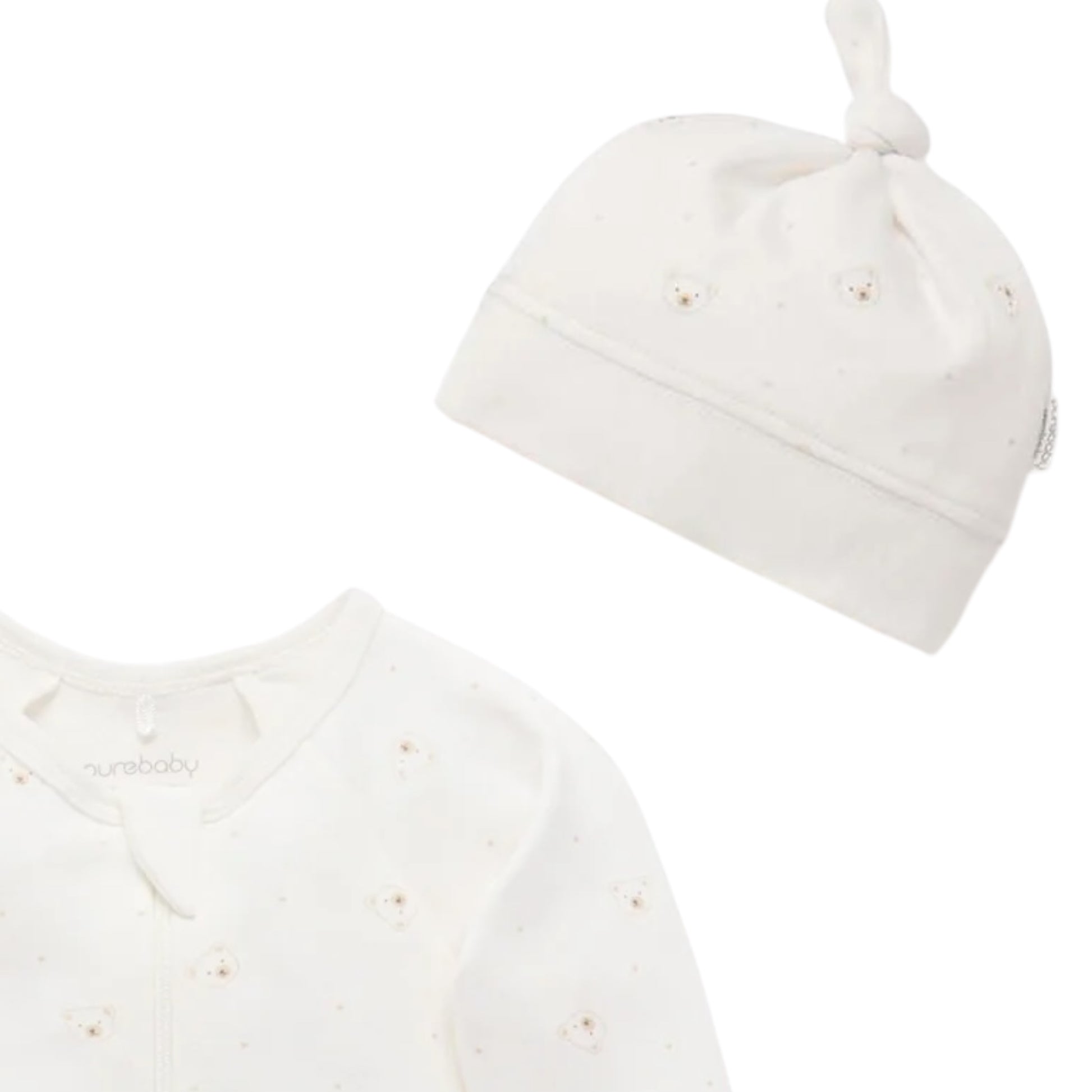 purebaby - 2 piece outfit, zip all in one and matching pull on hat, bear print